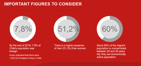 Il Cile ha un contesto nazionale di immigrazione difficile, con un marcato aumento delle migrazioni irregolari con scarse o nulle possibilità di regolarizzazione dello status. Le difficoltà più significative sono la necessità di maggiore flessibilità e la durata dei processi per ottenere un visto temporaneo (due anni) o permanente (cinque anni). In Cile vivono un milione e mezzo di stranieri, pari a circa l'8% della popolazione, e 900.000 hanno un'età compresa tra i 20 e i 39 anni, una popolazione economicamente attiva non trascurabile.