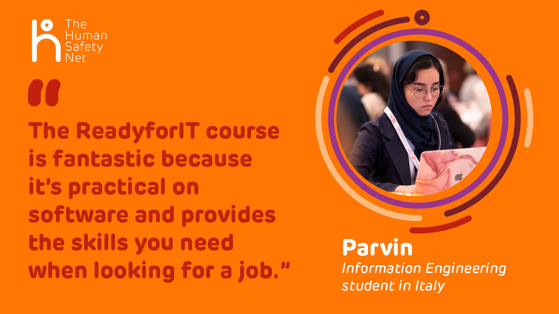 Nata in Afghanistan ma vissuta per la maggior parte della sua vita da sfollata in Iran con la famiglia, Parvin è arrivata in Italia nell'autunno del 2022, poco più che ventenne. Ora frequenta il corso di Ingegneria dell'Informazione all'Università di Padova, beneficiando di una borsa di studio. E ancora una volta, grazie ai Social Innovation Designers di A2030, ha frequentato il corso ReadyforIT lanciato da Fondazione Italiana Accenture in partnership con The Human Safety Net nella prima metà del 2023. Dice: "Il corso ReadyforIT è fantastico perché è pratico sul software e fornisce le competenze necessarie per la ricerca di un lavoro".