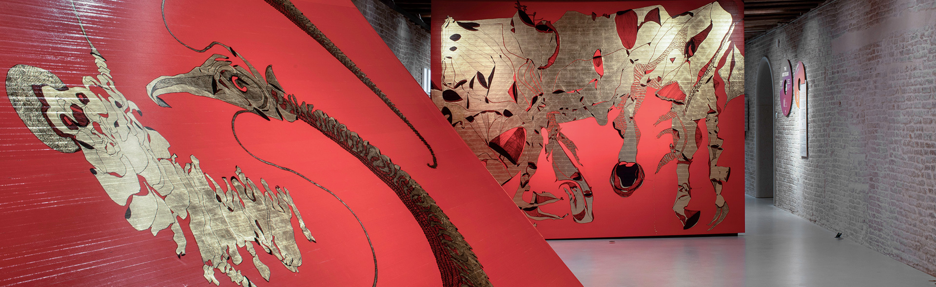 Pater, il Sovra-Vissuto è una grande struttura bidimensionale pensata per dividere in due lo spazio, realizzata con gli stessi materiali della tenda: su un verso un tessuto rosso creato tendendo sulla tela metri di nastro adesivo da lavoro, su cui campeggia un disegno in foglia metallica, sull’altro il Cameluxe, una calda lana di cammello riciclata.