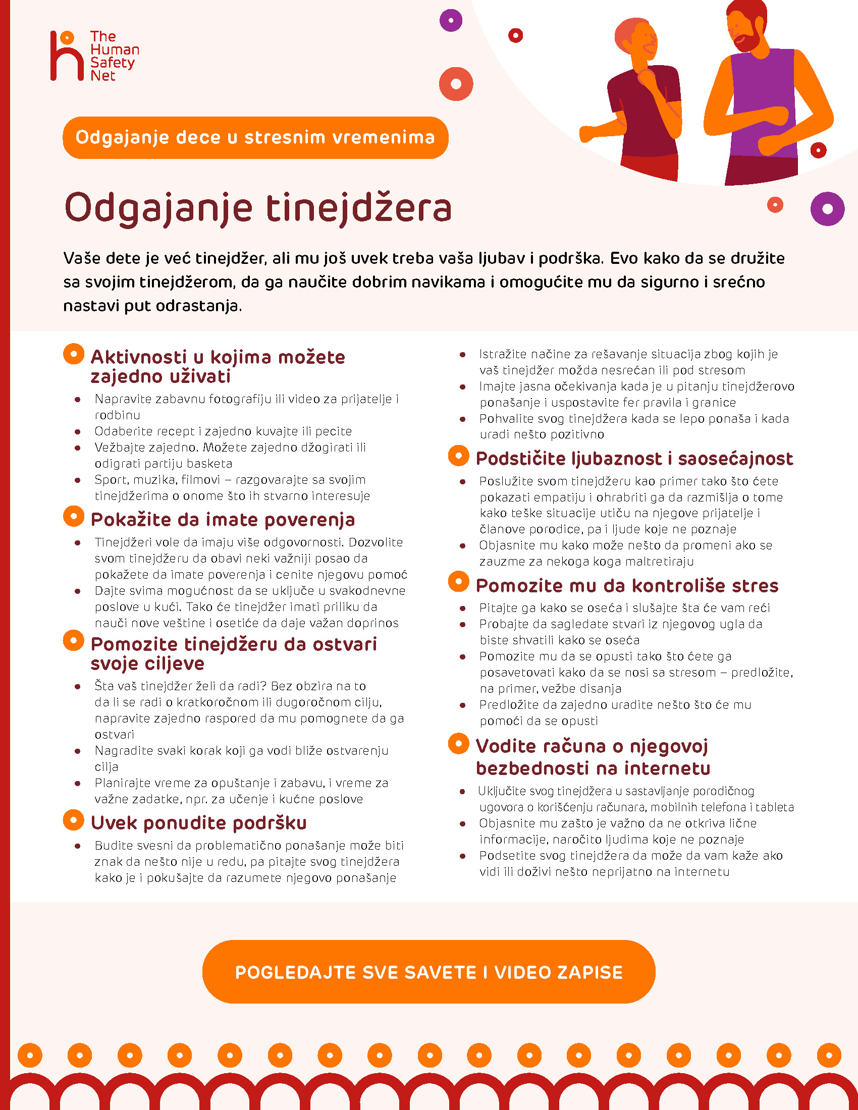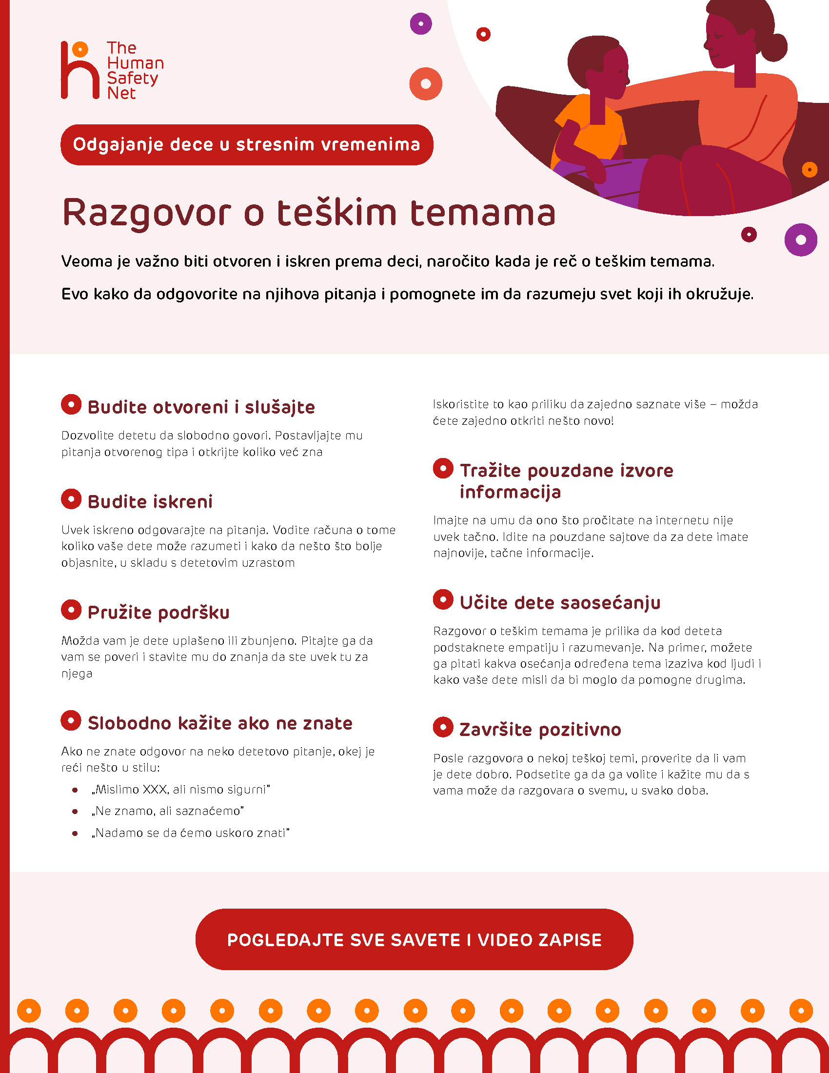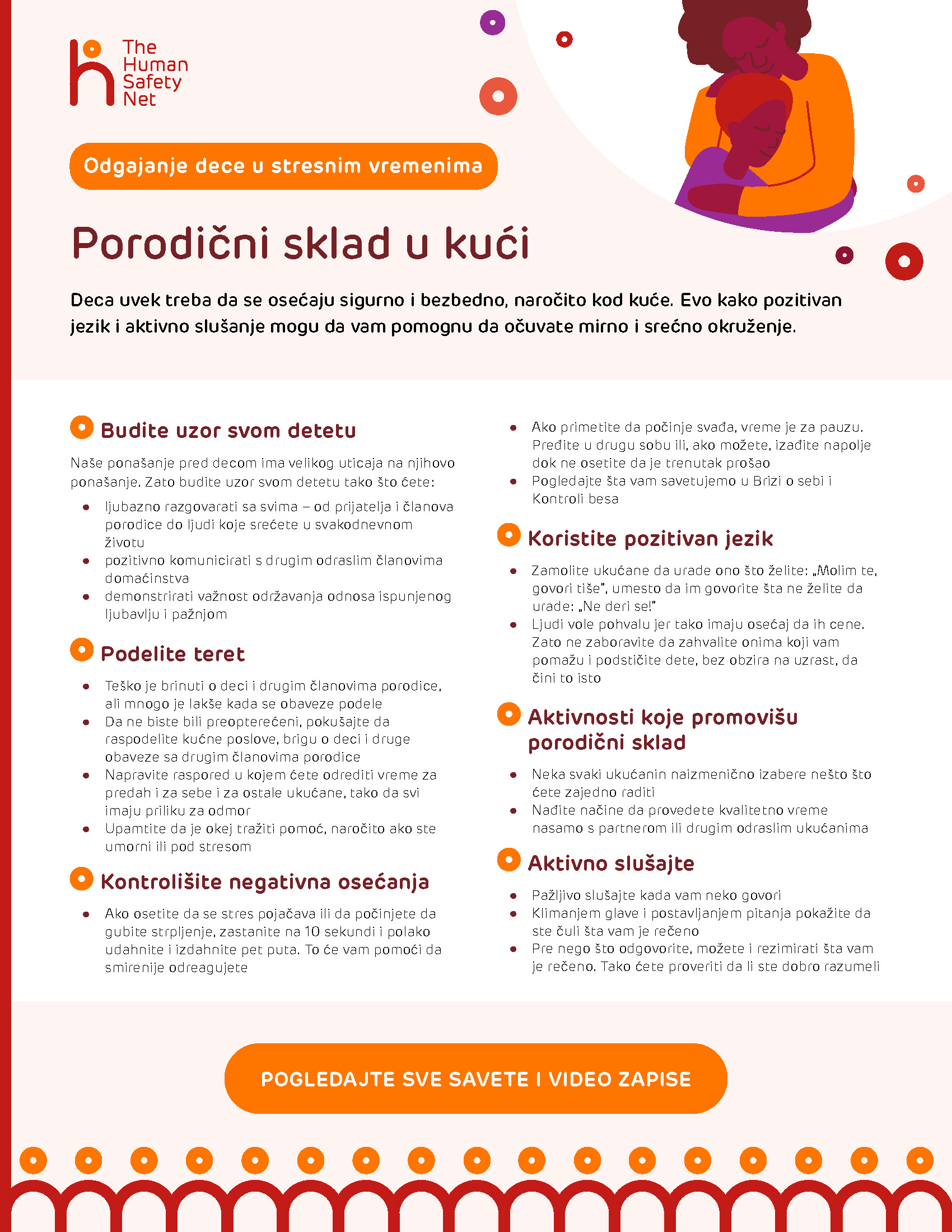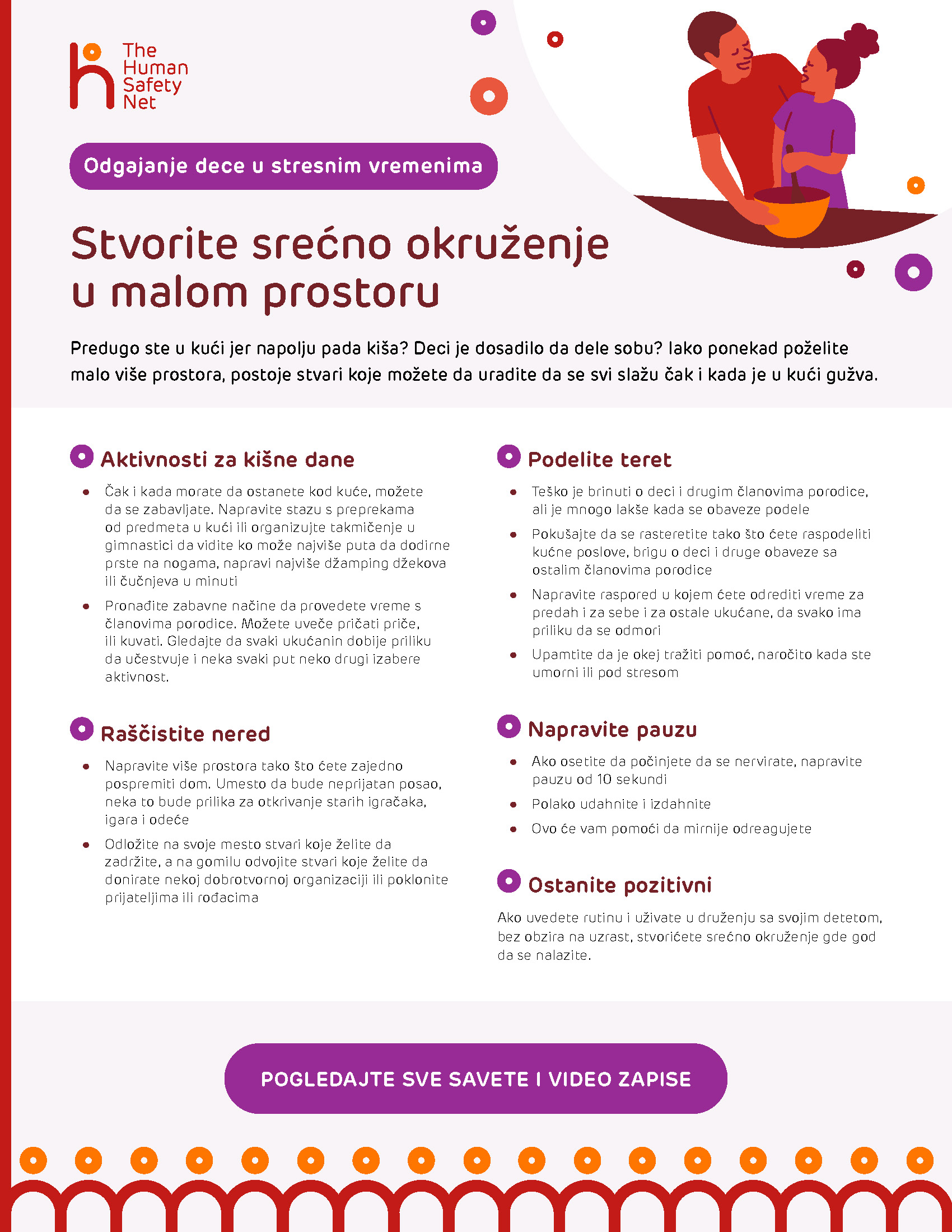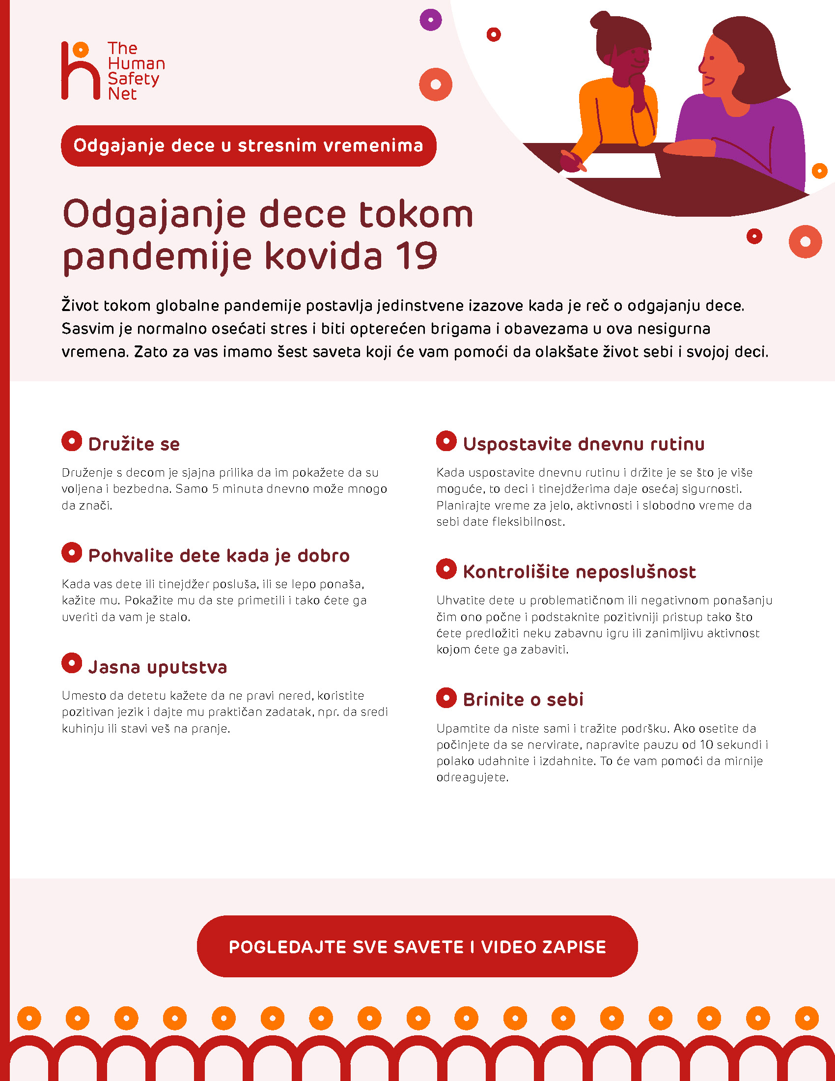 Pogledajte brojne savete za roditelje i video-zapise iz stvarnog života hiljada roditelja širom sveta. Dokazano pružaju podršku majkama i očevima koji se suočavaju sa teškim ili stresnim situacijama. Međunarodni stručnjaci, među njima i oni iz UNICEF-a, doprineli su izradi ove zbirke, koja će koristiti vama i mnogim drugim roditeljima širom sveta.